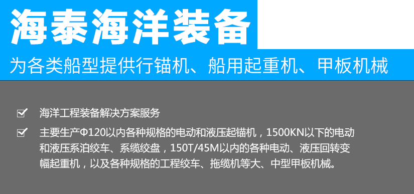 江蘇海泰海洋裝備有限公司位于素稱“銀杏之鄉(xiāng)”的泰興市,2018年投資建設(shè),至今已經(jīng)成為產(chǎn)品研發(fā)、生產(chǎn)制造,調(diào)試服務(wù)為一體的設(shè)備配套企業(yè)。公司從事海洋裝備(設(shè)備)及配件的制造、設(shè)計(jì)、安裝,維修;船用錨機(jī)、絞車、起重機(jī)、舾裝件、電氣設(shè)備、環(huán)保設(shè)備設(shè)計(jì)、制造。公司成立以來,就與中國船舶工業(yè)集團(tuán)公司第701所、702所、704所、708所、上海船舶研究設(shè)計(jì)院等多家船舶科研院所建立了技術(shù)合作關(guān)系,產(chǎn)品應(yīng)用于......